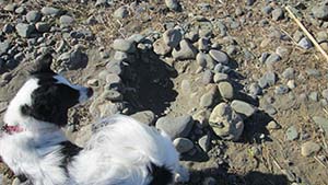 | マリーはもう進みたくて仕方がない。 | キャンプの下ごしらえか? | 石に妙な落書きが・・・ | 火事はもう下火らしい。 |