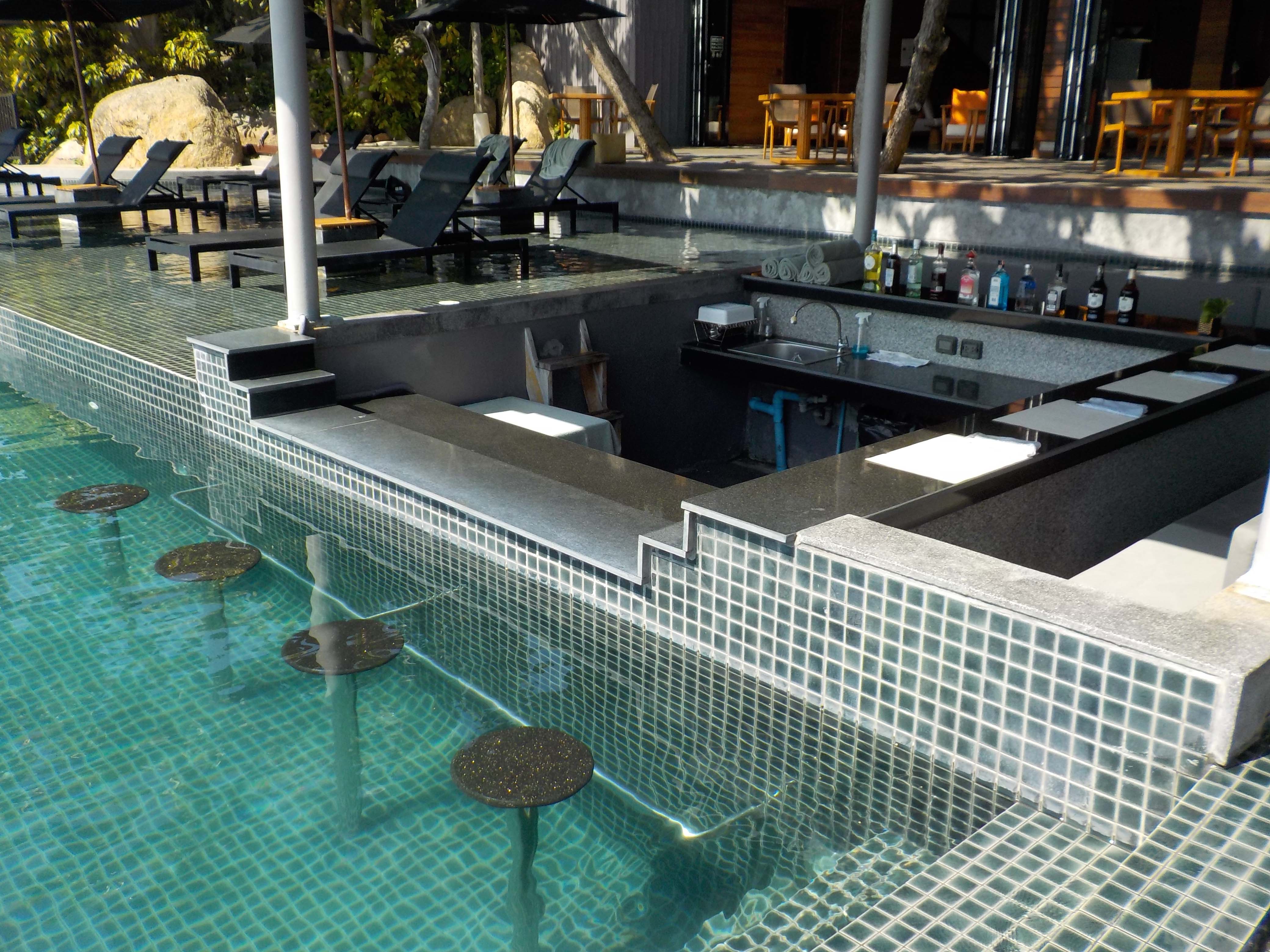 | プール・バーは閉まっていたが、開くのが遅いらしい。 プールには海で泳いだ後で来たのだが、 ここでも無料の水を出してくれた。 |