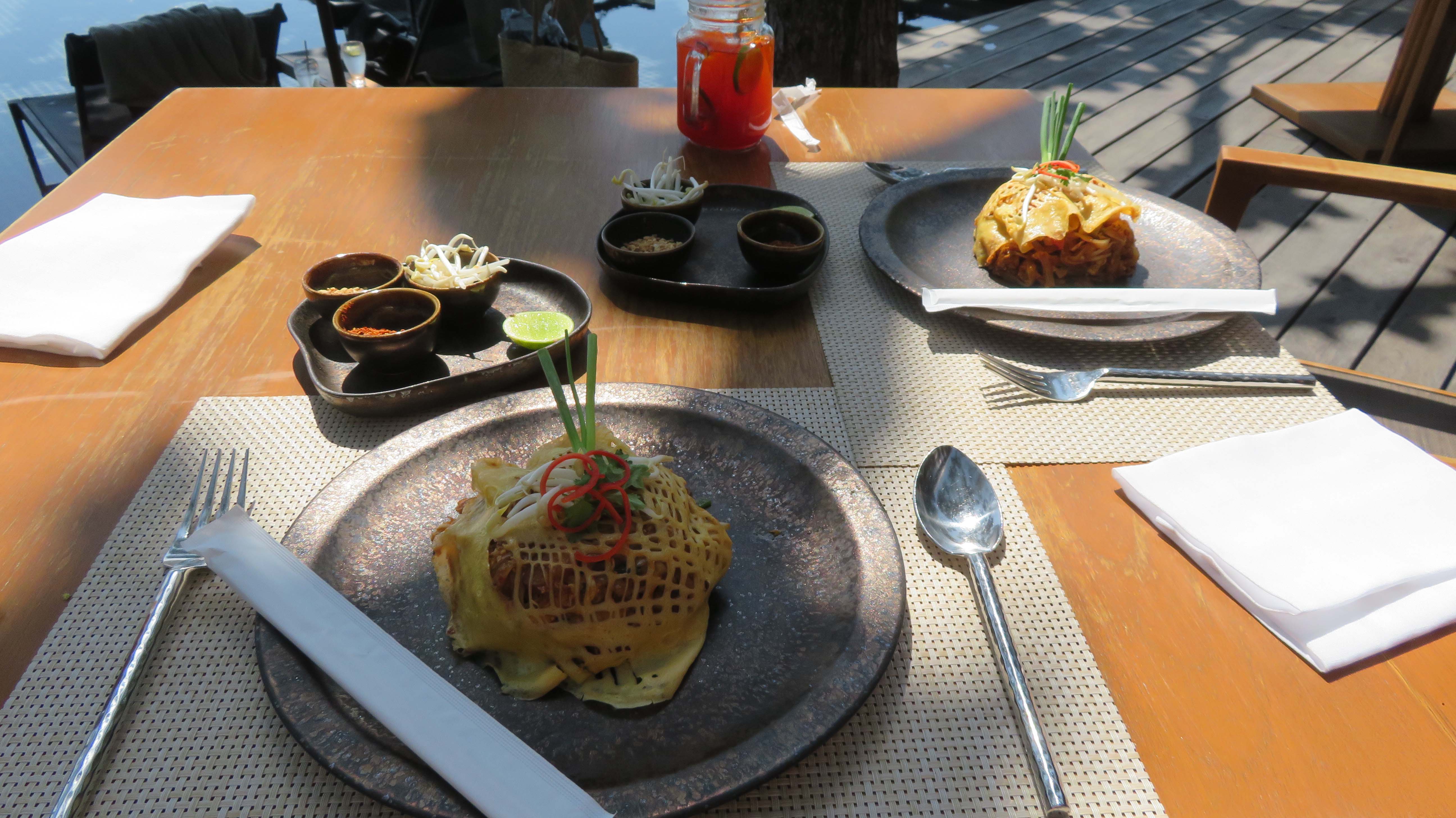 | 昼飯にパットタイ・ガイ(鶏肉の焼きそば)とクン(エビ)を。 | ||||