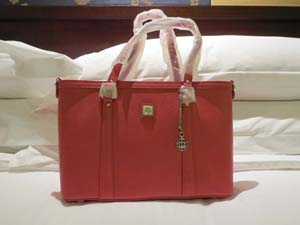 | Shaw House内の伊勢丹にて妻のショルダー・バッグを購入。 | 購入したショルダー・バッグ。$332.1。ショルダー・ストラップは中に 入っている。黄色いポーチはオマケ。そこいら中を見て回ったが、 安物は気にいったものがなく、高ければ長持ちするだろうと 購入に踏み切った。 |