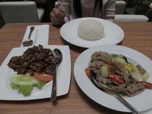 こちらがABSOLUTE THAI。 | ABSOLUTE THAIのメニュー。 | 左:ヌア・パット・プリク タイ・ オーン(牛肉の胡椒炒め。辛い) 右:ヌア・パット・ナムマン ホーイ (牛肉の炒め物。ナムマン ホーイ というのは直訳すると貝油だが あまり深読みしなくとも良い) どちらも$12.9で、味も良い。 |