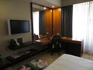 | ロビー | 泊まった部屋。部屋の種別は忘れたが1泊$265.55。 朝食込、禁煙、部屋のWiFiは無料で宿泊時にパスワードを貰える。 今回は宿泊費はケチったつもりだがシンガポールの宿は高く、 この値段でもサービスチャージ類が付加されると$320位には なってしまう。それでも元々その値段のところに上乗せされるよりは マシだ。但しシンガポールの中級以上の宿は何処でもそうだが 布団は素晴らしく寝心地が良かった。 |