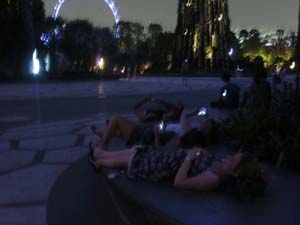 | Supertree Grove、イルミネーション・ショーの動画。 | ベンチに寝転んでショーを鑑賞する ヨーロピアン達。 |