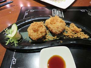 | 牛肉の炒め物 $30 | ホタテの唐揚げ @$6 | 蟹肉のチャーハン $30 (写真はよそっただけで、もっと 大きなボールで来ている) |