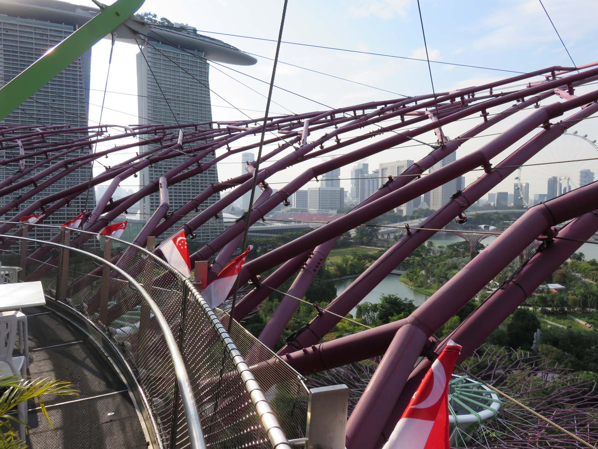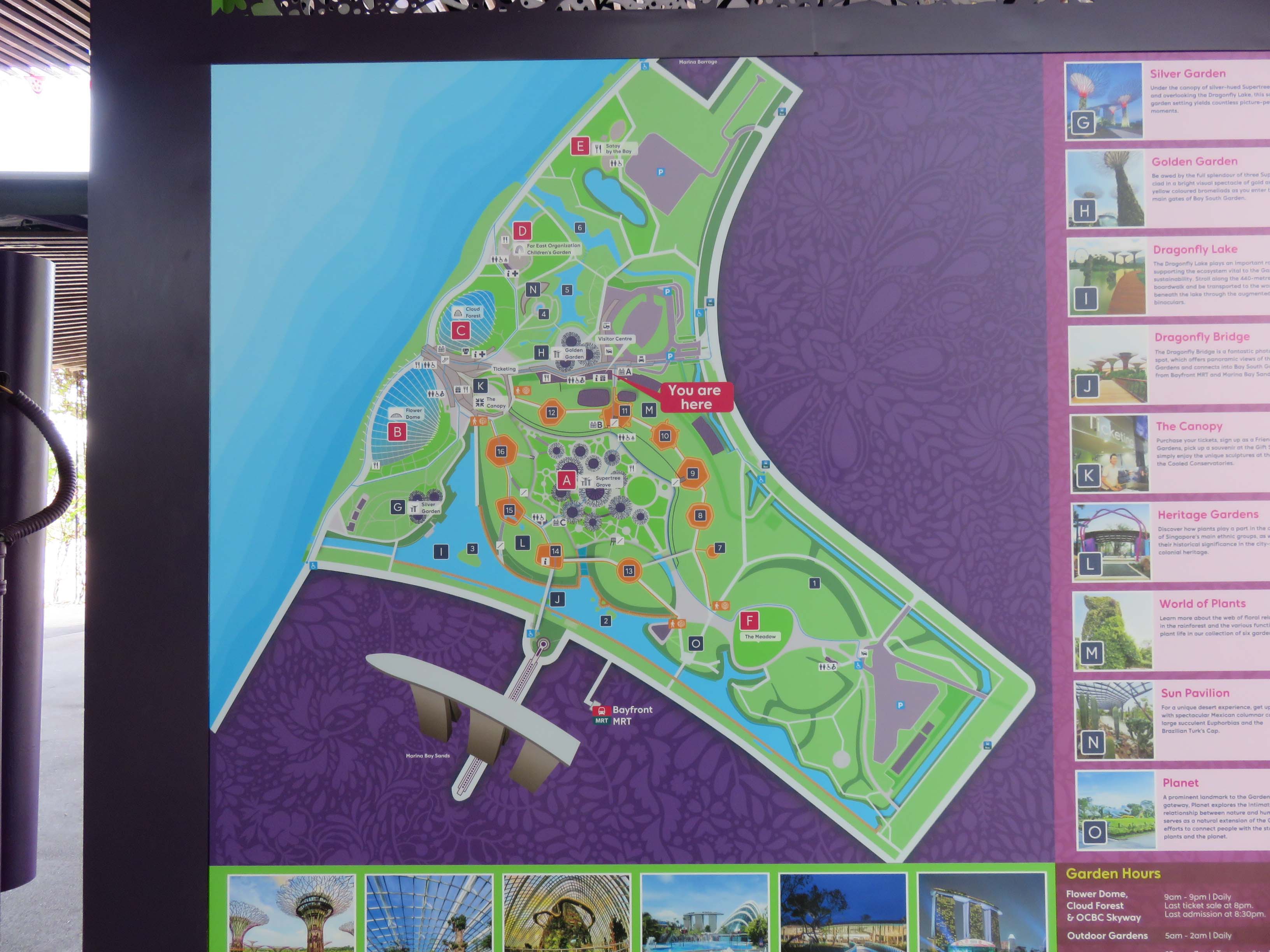 Marina Bay 戻る 3日目、Gardens by the Bayに直行する予定だったのだが、 妻がくだらないMerlion Parkにまた行きたいと言い出したので、とんだ寄り道をすることに。 しょうもないMerlion parkの写真はここでは割愛する。 Gardens by the BayはOCBCに上ってみたかったのと、土産物店を利用したかったので、 行くのであれば、Super Tree Showを見られる20時手前か21時手前。 そのため、16〜17時にGardensに入って、OCBCには18時頃上って、IndoChineには19時頃入店し、 そこからをショーをご覧になってやろうという計画だった。 しかし、計画に誤差が生じるのは既に実証済みだ。 |