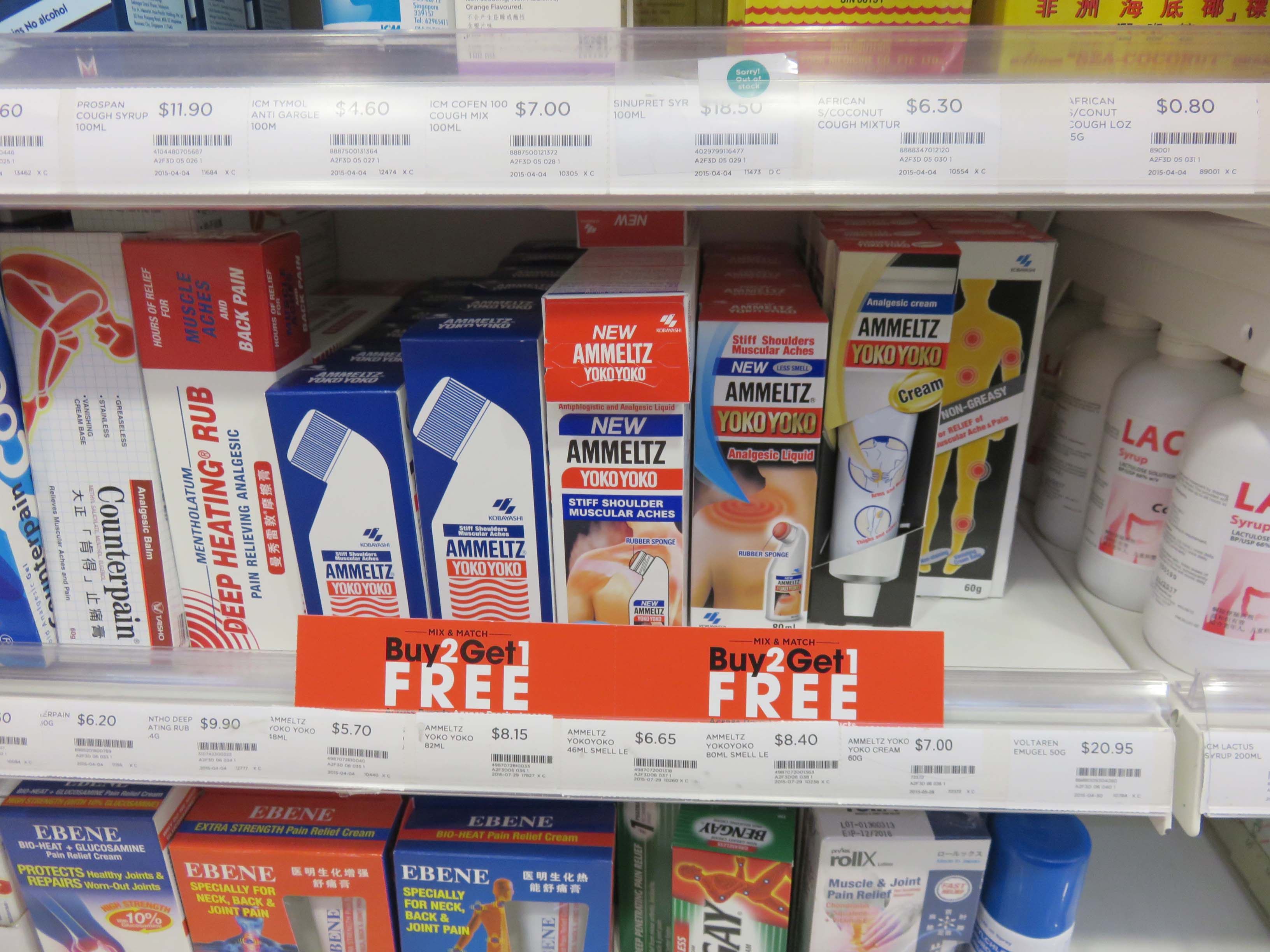 | 私は歳のせいか疲労すると目や後頭部が痛くなるので、アンメルツ・ヨコヨコが必需品である (湿布はかぶれる)。ところでシンガポールでは薬局を見たことがなかったので、ホテルの従業員に聞くと 「watsonsがある」という。してそれはどこに?「隣のThe Coffee Beanがあるビルの地下だよ!」 |