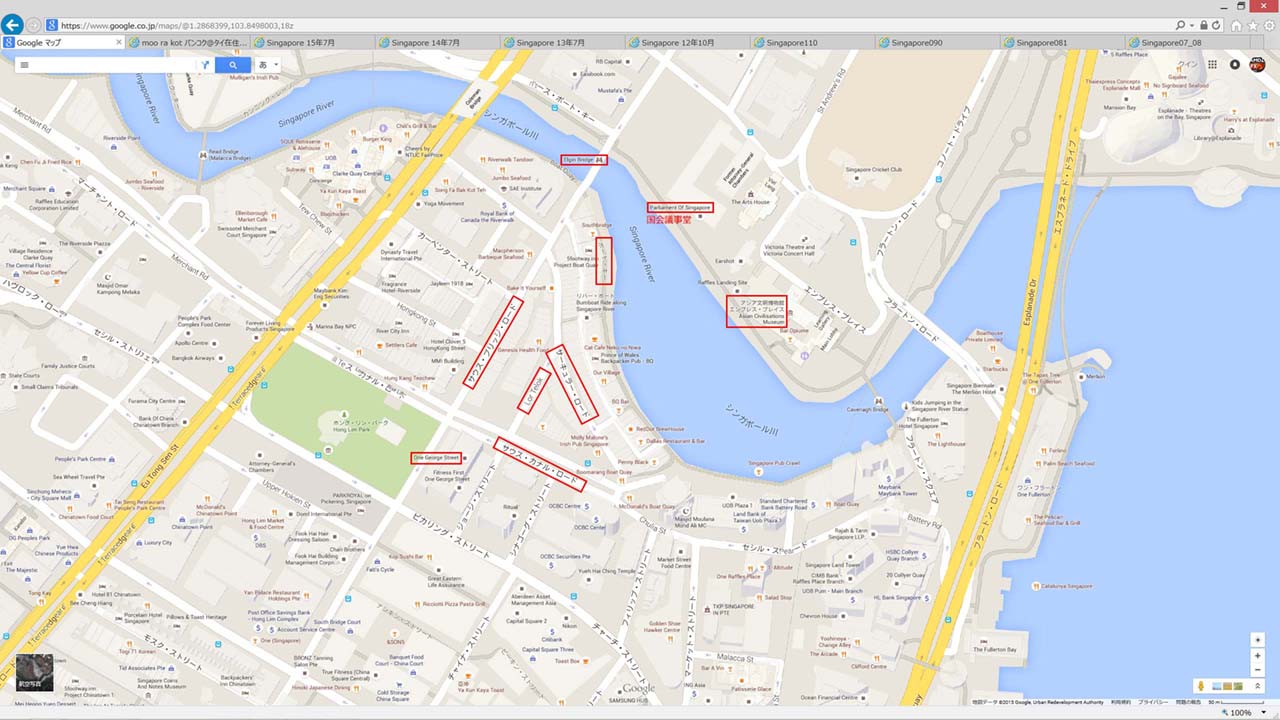 2日目の計画はこうだった。今年の旅行は3泊を予定していたため、 妻に書店で(タイ語の)ガイドブックを買ってあげて、どこか行きたいところはないかと聞いたみた。 その結果、レッド・ドット・トラフィックと C: Fountain of Wealthに行ってみたいとのこと。 後者は噴水に触れられる時間が決まっており、ネオン化された夜が良いとのことなので18:00〜19:30。 夜はD: Boat Quayに行こうと決めていた。そのため、レッド・ドット〜は昼間に攻略することにした。 |