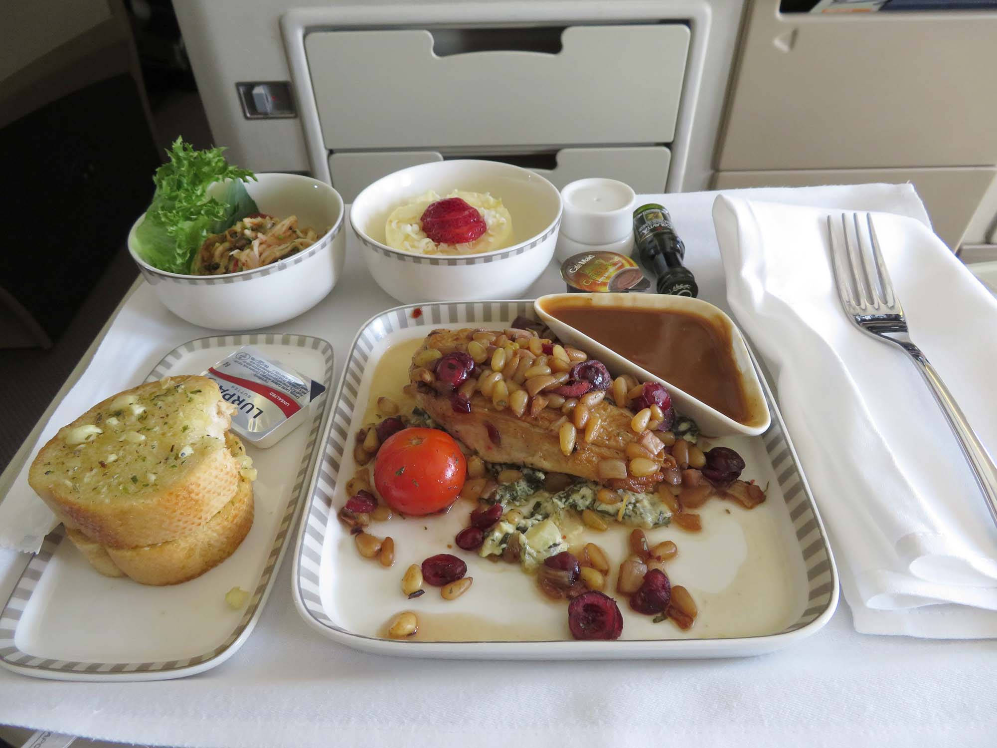 | 妻が機転を利かせて店員さんに ツーショットを依頼した。 往路のスッチーの埋め合わせだとのこと。 でかした! 後で写真を見たら、訓練生の方らしかった。 |